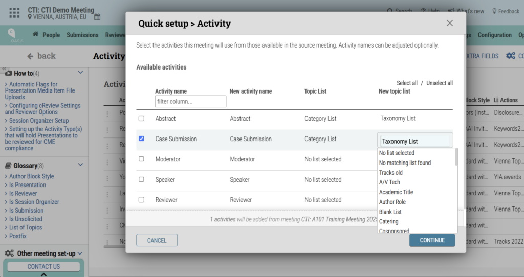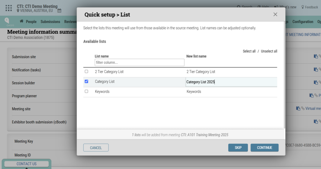 • Select any list to copy. When you do, its row may highlight yellow—this indicates that a list with the same name already exists in the new meeting. You must rename it in the New list name field (e.g., “Category List” → “Category List 2025”), otherwise the import won’t allow duplicate names.